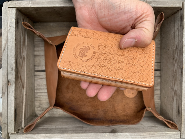 Das handgefertigte Card Wallet „Flower of Life“ ist mehr als nur ein Wallet. Jedes Stück wird mit Hammer und Stempel geprägt, mit der Stechahle gelocht und im Sattlerstich von Hand vernäht.